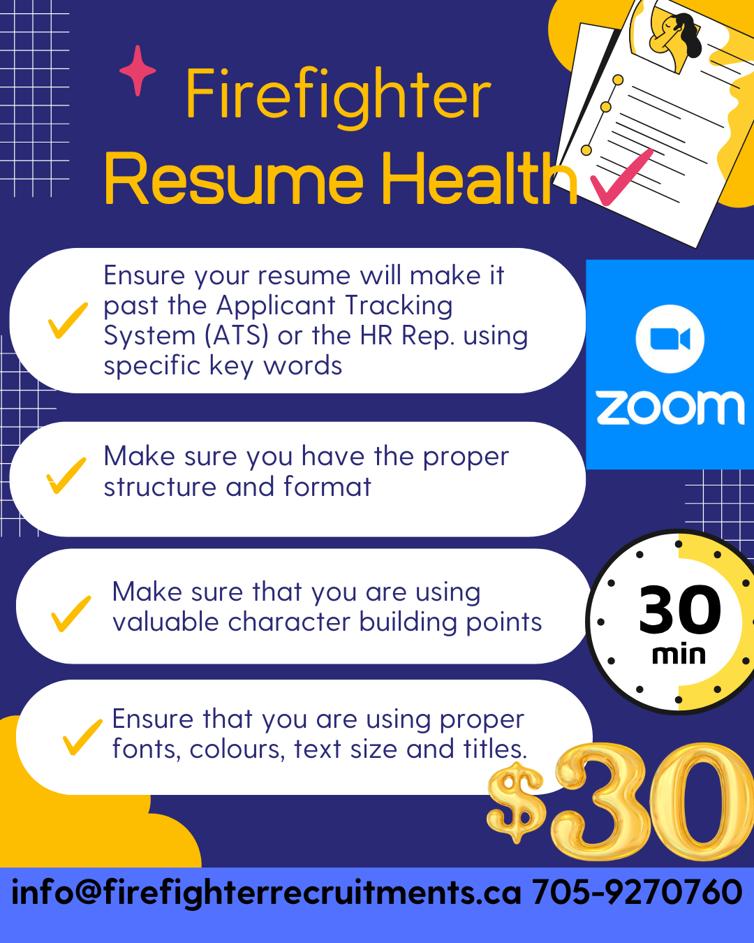 We provide resume review sessions for $30.00, including a 30-minute Zoom consultation to assess your current resume and recommend improvements. To schedule your review, email info@firefighterrecruitments.com.
